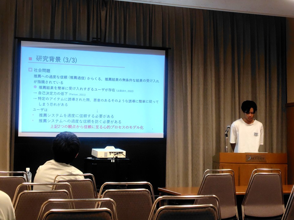 CATEGORY 研究トピック 藤元さんが日本社会心理学会第66回大会で発表 (2025.9.20) 2025.12.27 研究トピック soc-ja メディア心理学研究室 山田君が情報処理学会WebDB2025で受賞 (2025.9.16) 2025.12.27 研究トピック soc-ja メディア心理学研究室 人工知能学会SIAI2025研究室展示 (2025.9.12) 2025.12.18 研究トピック soc-ja メディア心理学研究室 9月中間発表会 (2025.9.19) 2025.09.19 研究トピック soc-ja メディア心理学研究室 ポスター発表会を行いました (2025.7.26) 2025.07.27 研究トピック soc-ja メディア心理学研究室 7月中間発表を行いました (2025.7.19) 2025.07.22 研究トピック soc-ja メディア心理学研究室 土方教授が協力したレコメンド実験の記事が朝日新聞に掲載されました 2025.07.09 研究トピック soc-ja メディア心理学研究室 関学高森ゼミ・九大安田ゼミとの合同ゼミ (2025.6.21) 2025.06.21 研究トピック soc-ja メディア心理学研究室 石崎さんの研究が国際論文誌に掲載されました (2025.4.9) 2025.04.16 研究トピック soc-ja メディア心理学研究室 森本さんの研究が国際論文誌に掲載されました (2025.3.31) 2025.03.31 研究トピック soc-ja メディア心理学研究室 もっと見る